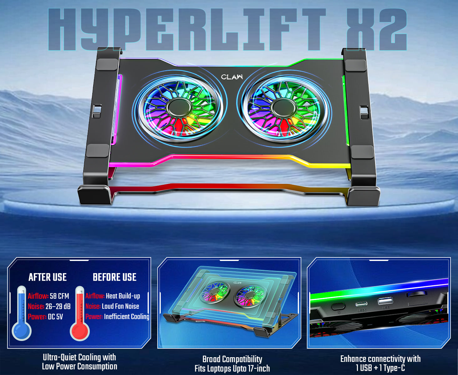 - Ultra-Quiet Cooling with Low Power Consumption: Operating at a quiet 26–29 dB, the Hyper Lift X2 keeps your laptop cool without disturbing your workflow. It runs on DC 5V, consumes just 3W, and delivers 58CFM airflow for efficient cooling throughout extended use.