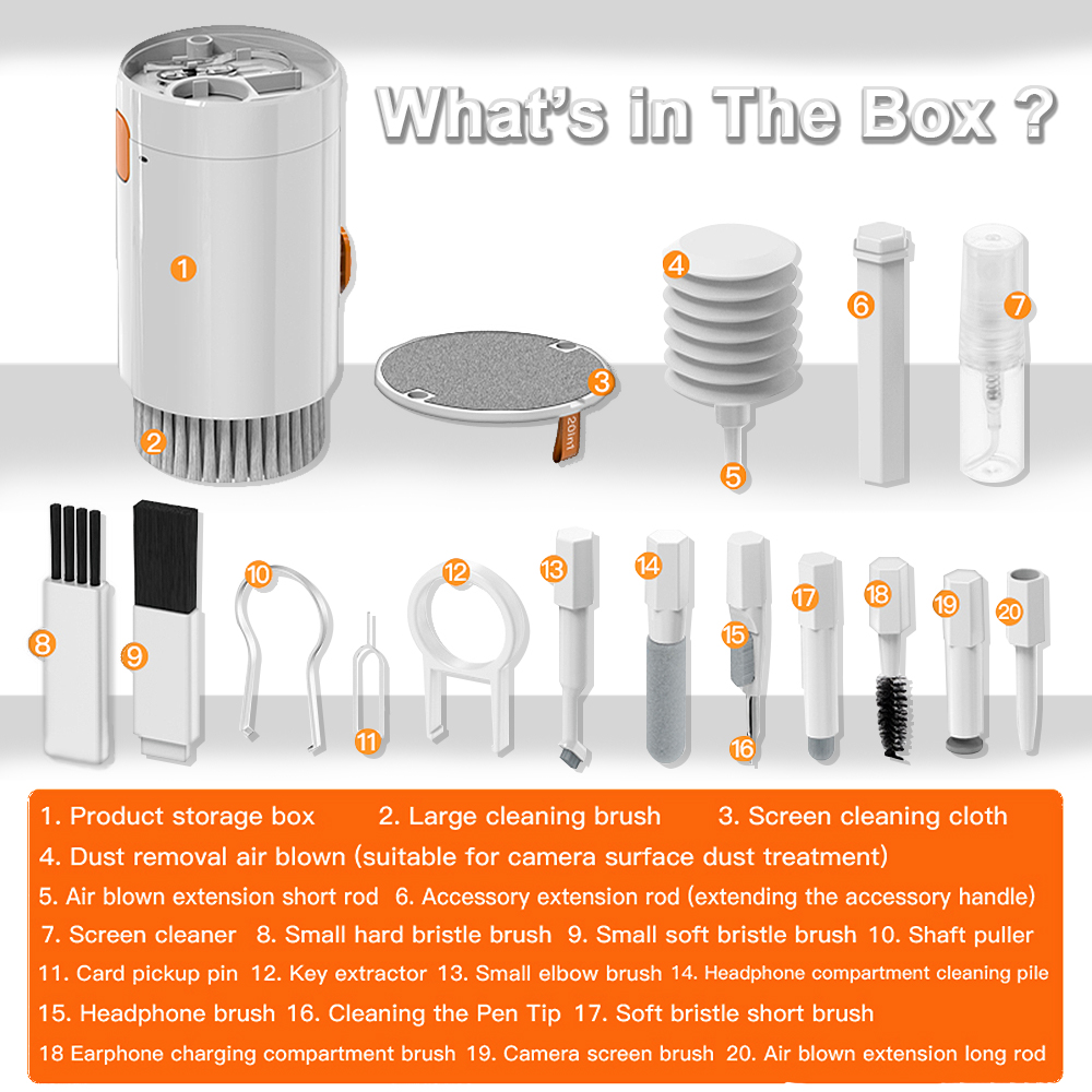 - 360° Cleaning Solution: CLAW Q20 includes Large Cleaning Brush, Dust Removal Air Blow, Air Blown Extension short and long rod, Accessory Extension Rod, Screen Cleaner, Small Hard Bristle Brush, Shaft Puller, Key Puller, Card Pickup Pin, Small Elbow Brush, Headphone Compartment Cleaning Pile, Headphone Brush, Cleaning Pen tip, Soft Bristle Short Brush, Camera Screen Brush and Screen Cleaning Cloth making it a comprehensive cleaning solution for a sparkling clean device.