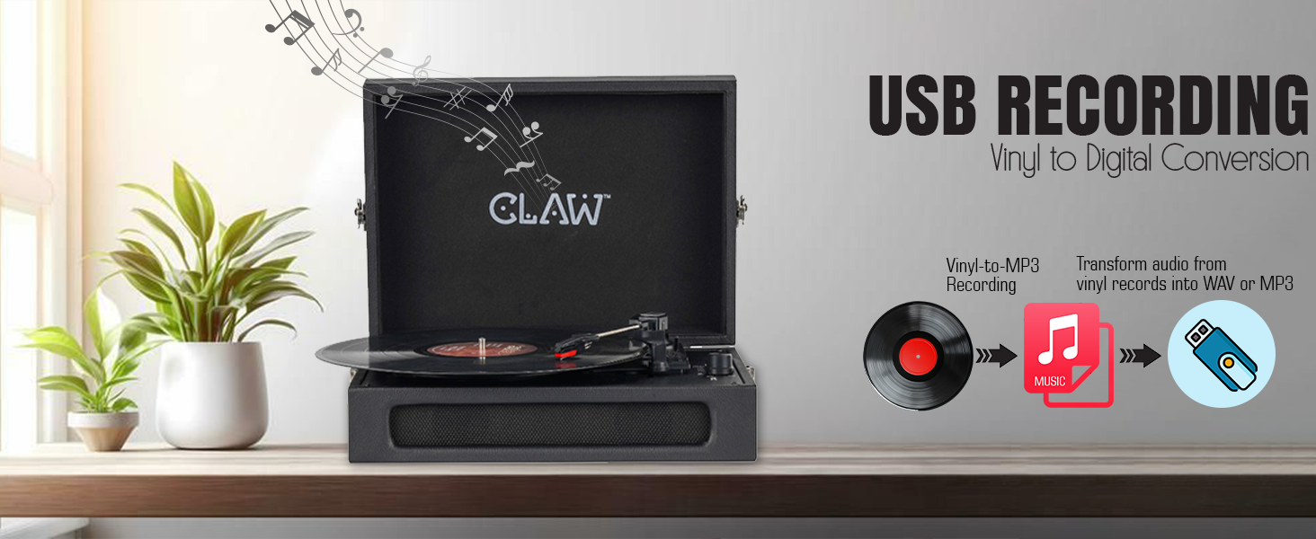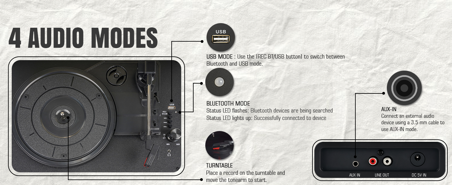- 🎵 Bluetooth 5.3 + USB Recording Function: Features Bluetooth 5.3 for fast, stable wireless connections. USB Recording Function allows 1:1 real-time recording of vinyl (from USB slot) to a USB stick (max. 32GB, FAT32 format) in MP3 (128kbps); no track info is captured.
