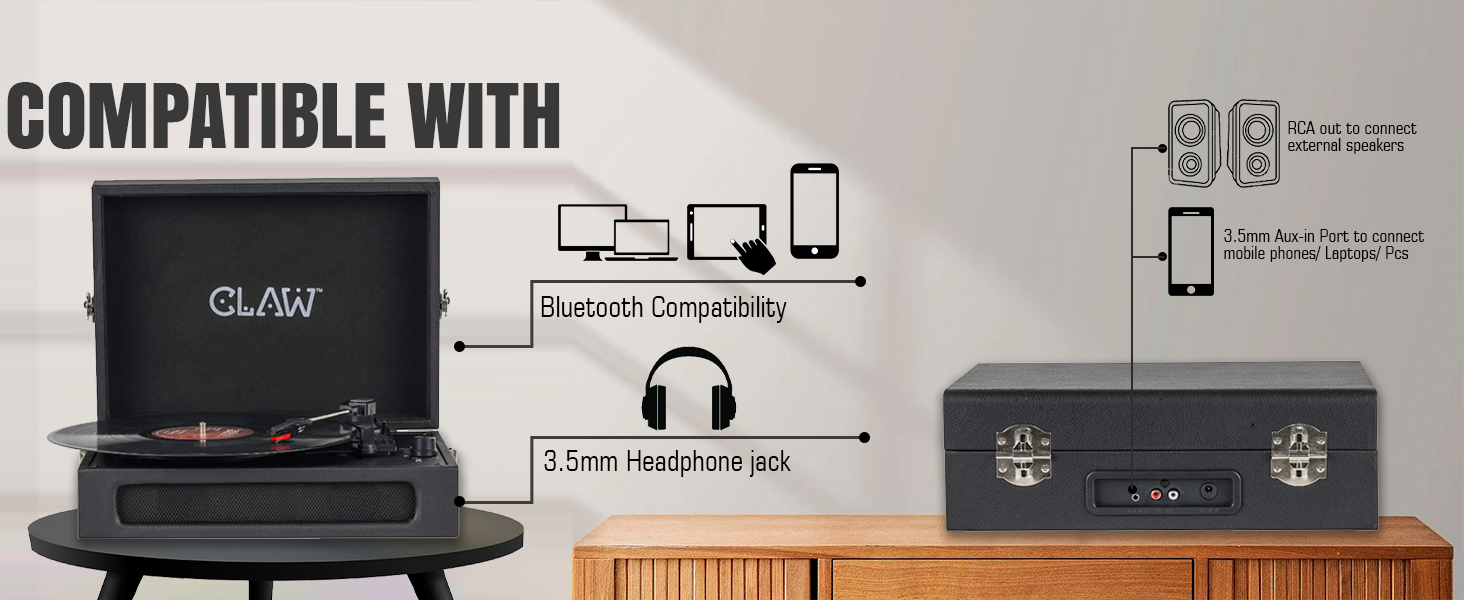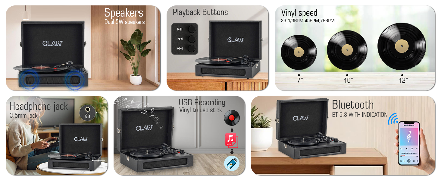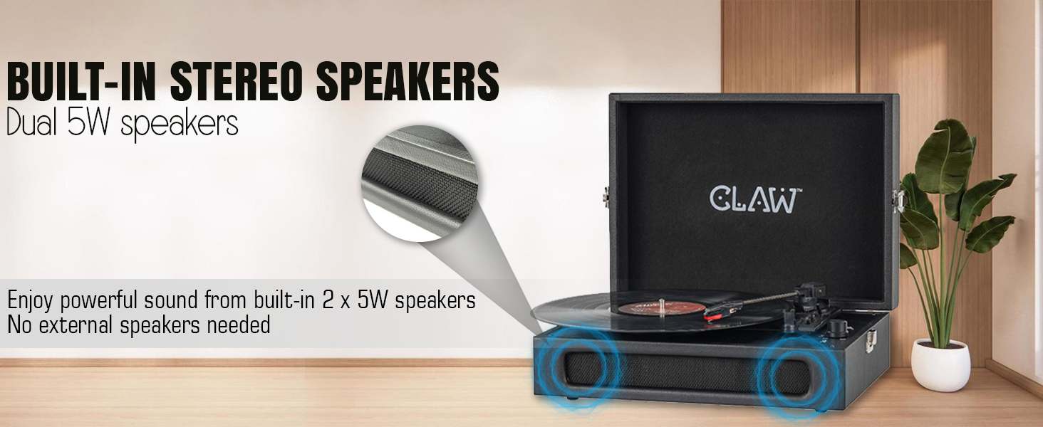 - 🔈 Dual 5W Built-In Stereo Speakers: Enjoy rich, room-filling sound from the integrated 2 x 5W speakers. Whether you’re spinning records or streaming via Bluetooth, no external speakers are needed for an immersive audio experience.