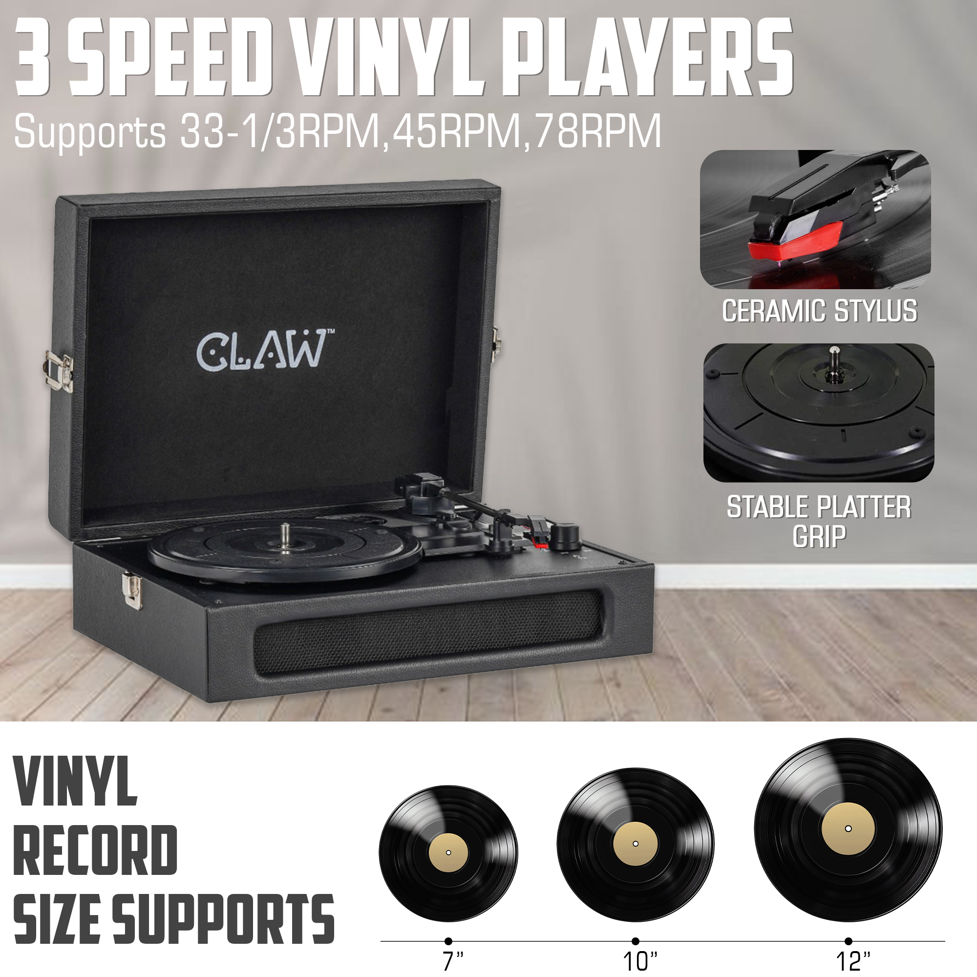 - 📀 3-Speed Turntable (33 / 45 / 78 RPM): Supports all three standard vinyl speeds—33⅓, 45, and 78 RPM—making it compatible with 7″, 10″, and 12″ records. Switch speeds easily to suit your vinyl collection and enjoy classic playback.