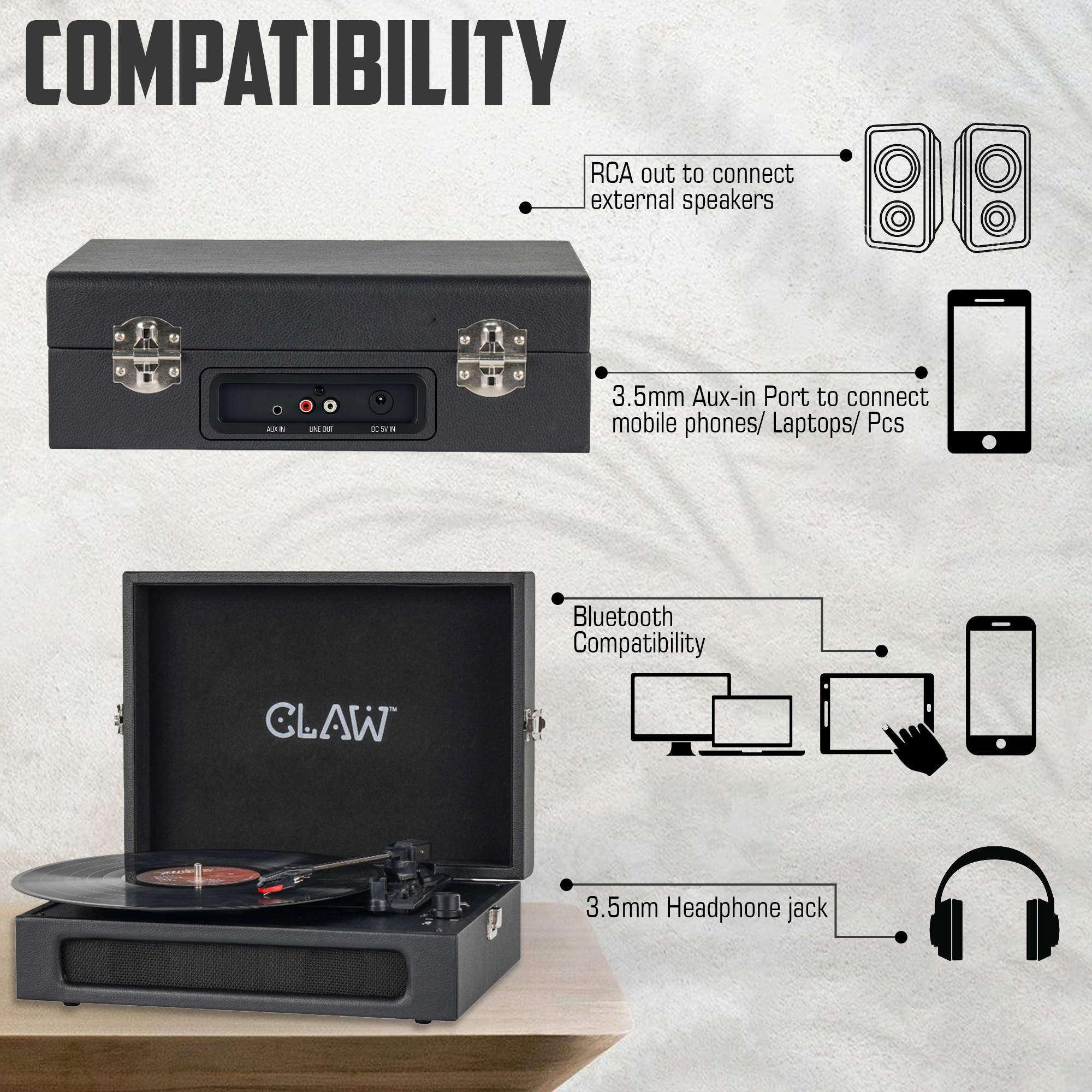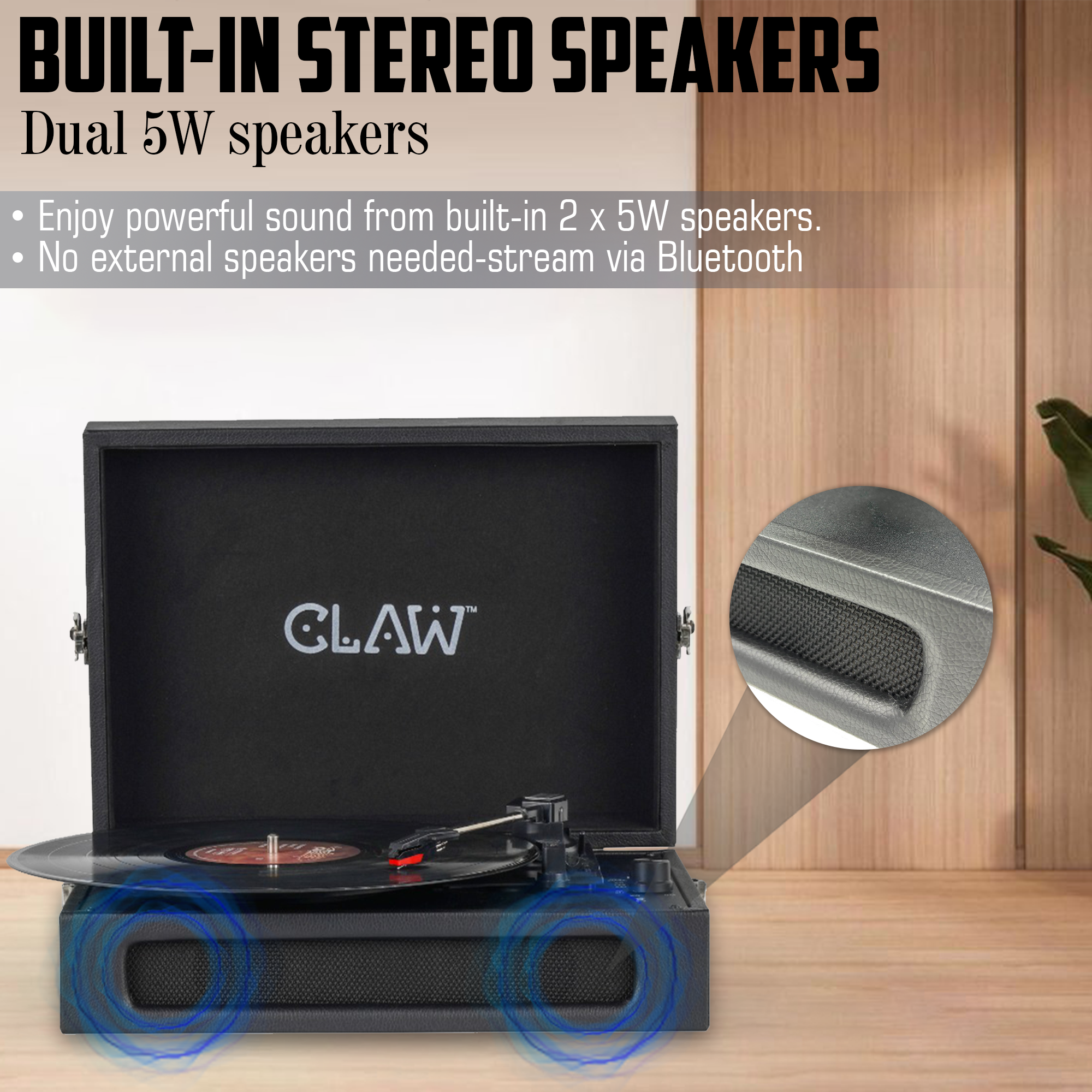 - 🔈 Dual 5W Built-In Stereo Speakers: Enjoy rich, room-filling sound from the integrated 2 x 5W speakers. Whether you’re spinning records or streaming via Bluetooth, no external speakers are needed for an immersive audio experience.