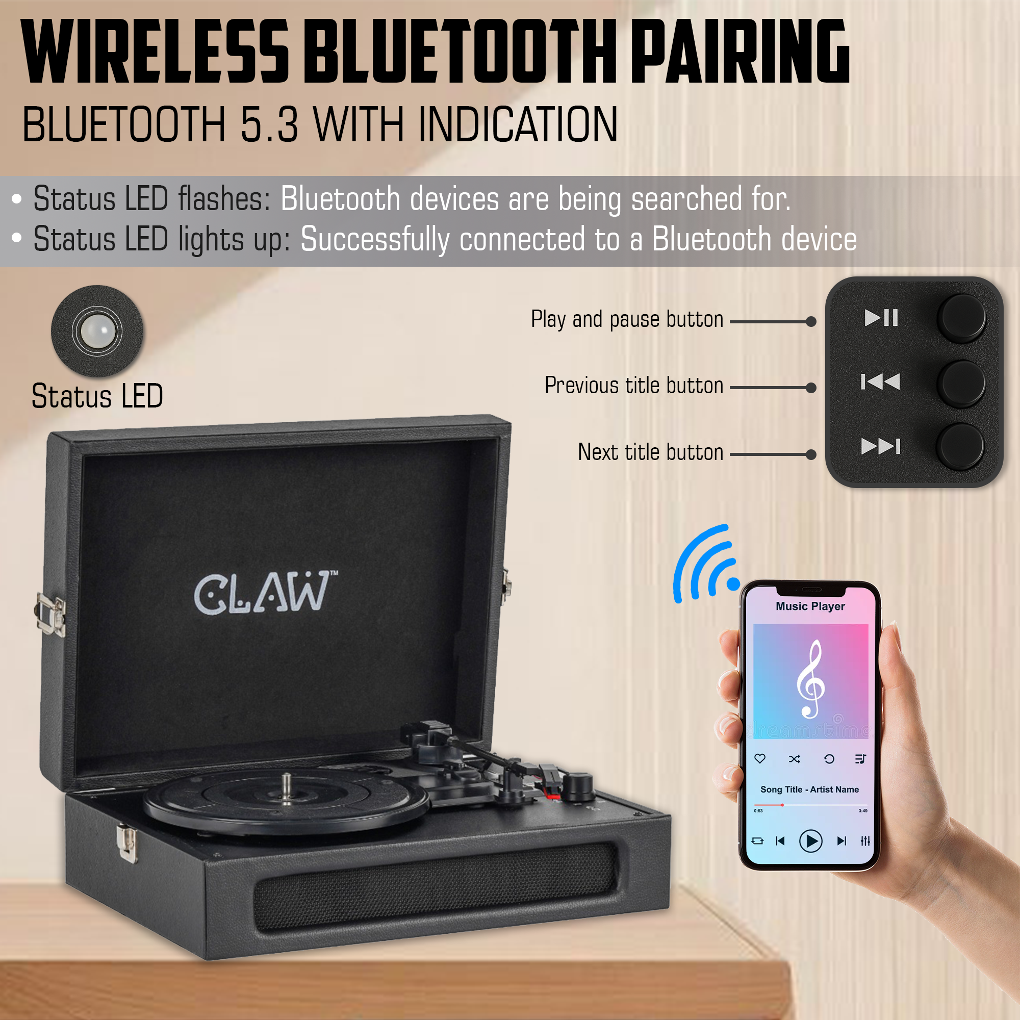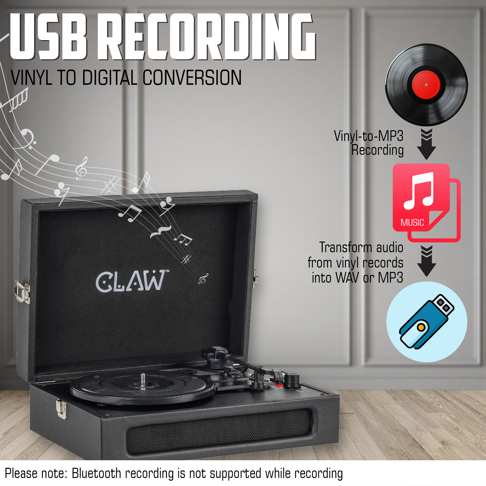 - 🎵 Bluetooth 5.3 + USB Recording Function: Features Bluetooth 5.3 for fast, stable wireless connections. USB Recording Function allows 1:1 real-time recording of vinyl (from USB slot) to a USB stick (max. 32GB, FAT32 format) in MP3 (128kbps); no track info is captured.