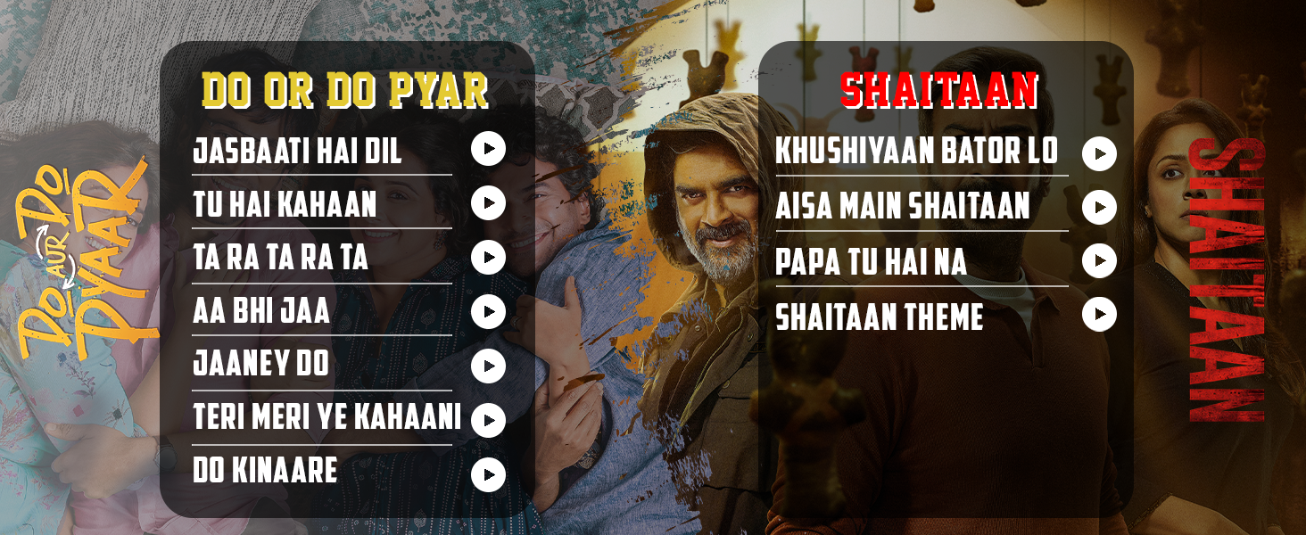 - Shaitaan+Do Aur Do Pyaar: The disc features and captures emotions of two completely opposite genera. Side A features the songs of “Do Aur Do Pyaar” which is a romantic comedy. The songs like “Jazbaati Hai Dil” and “Ta Ra Ta Ra Ta” dives into the feeling of falling in love. Feel and experience pain of separation and the complexities of relationships through songs like “Tu Hai Kahaan” and “Do Kinaare” and understand the emotion of rekindling love with “ Aa Bhi Jaa” Where as Side B features songs of “Shaitaan” which is a horror – thriller. The songs beautifully capture the family bond (Khushiyaan Bator Lo), and love of a father for her daughter (Papa Tu Hai Na). The “Shaitan Theme” and “Aisa Main Shaitaan” are haunting and electrifying song that delves into the antagonist’s psyche and encapsulates the film’s supernatural essence.