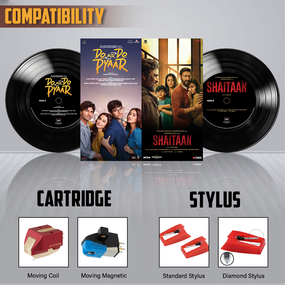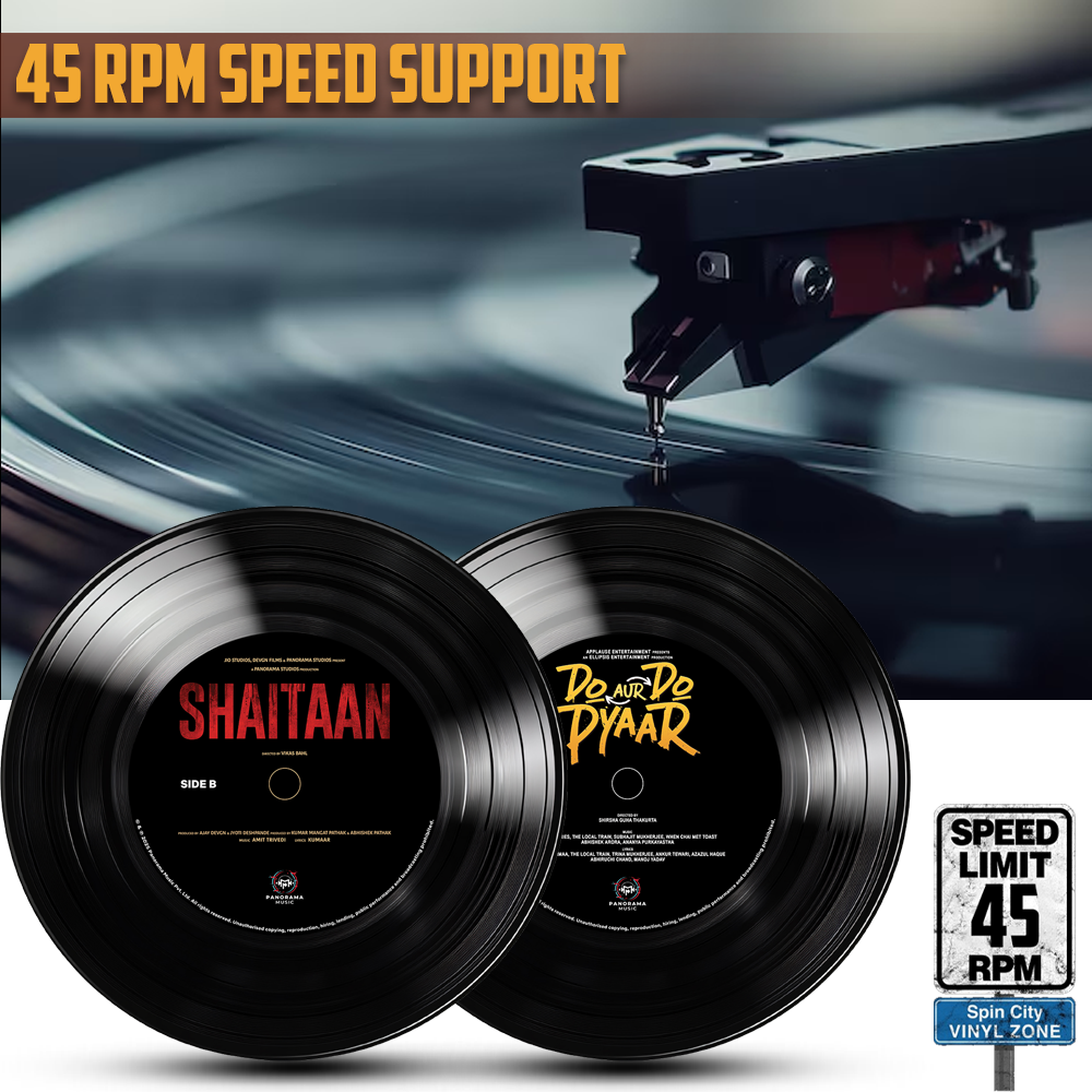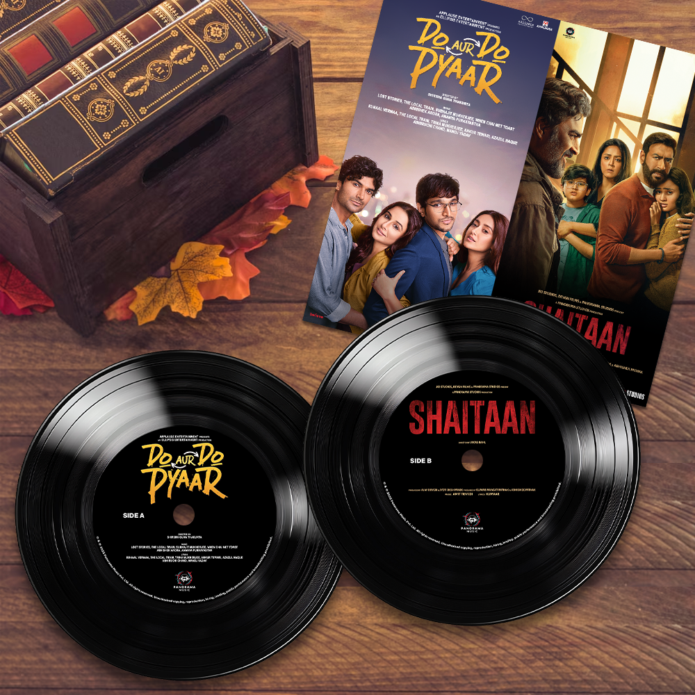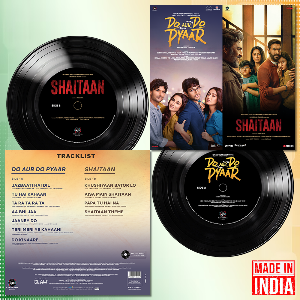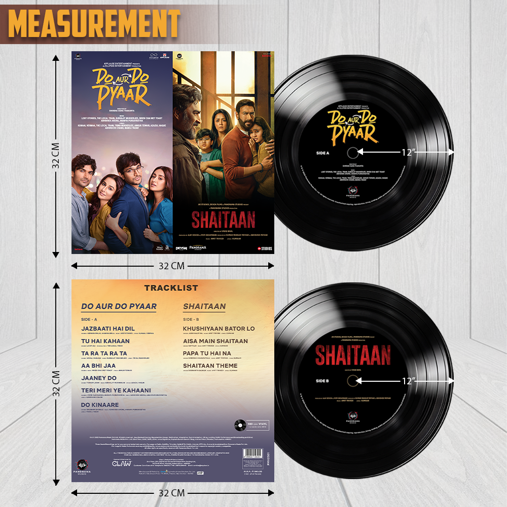 - Shaitaan+Do Aur Do Pyaar: The disc features and captures emotions of two completely opposite genera. Side A features the songs of “Do Aur Do Pyaar” which is a romantic comedy. The songs like “Jazbaati Hai Dil” and “Ta Ra Ta Ra Ta” dives into the feeling of falling in love. Feel and experience pain of separation and the complexities of relationships through songs like “Tu Hai Kahaan” and “Do Kinaare” and understand the emotion of rekindling love with “ Aa Bhi Jaa” Where as Side B features songs of “Shaitaan” which is a horror – thriller. The songs beautifully capture the family bond (Khushiyaan Bator Lo), and love of a father for her daughter (Papa Tu Hai Na). The “Shaitan Theme” and “Aisa Main Shaitaan” are haunting and electrifying song that delves into the antagonist’s psyche and encapsulates the film’s supernatural essence.